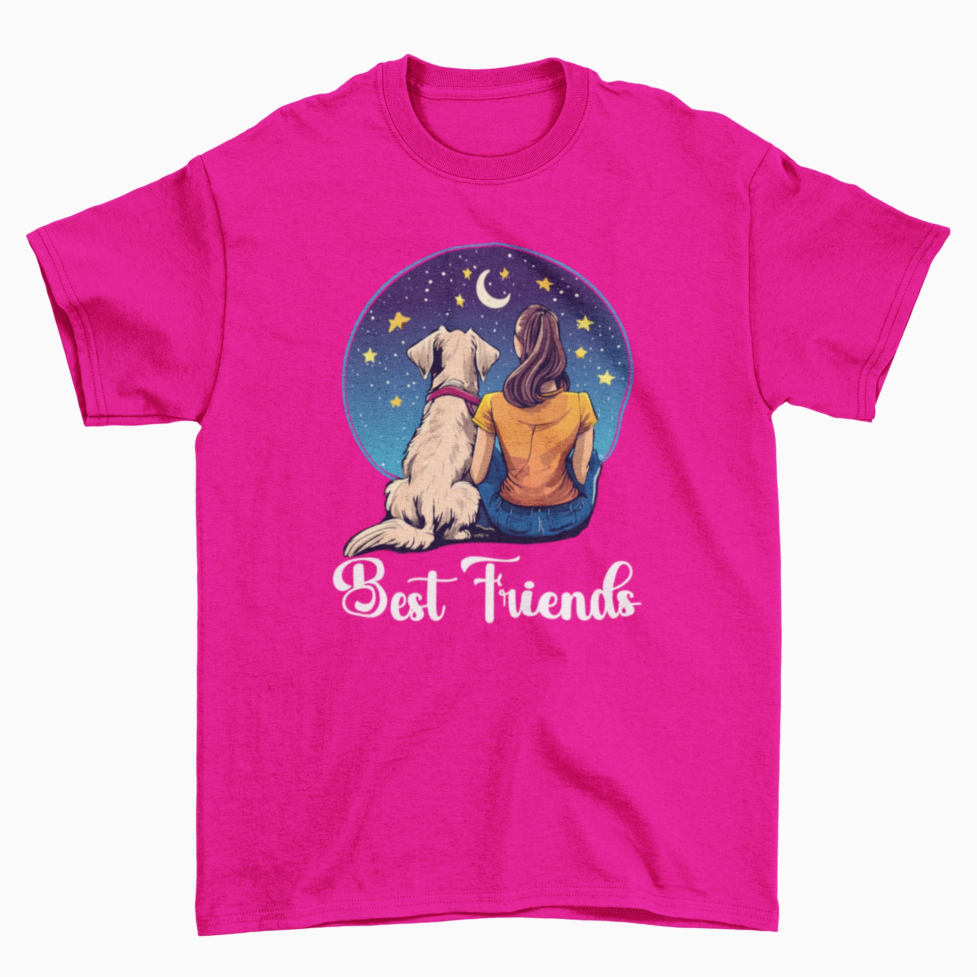 Celebrate the unbreakable bond between a girl and her dog with this heartwarming tee. Featuring a serene design of a girl and her loyal pup gazing up at a star-filled night sky, the image is paired with the phrase “Best Friends” to capture the magic of companionship that lasts a lifetime.