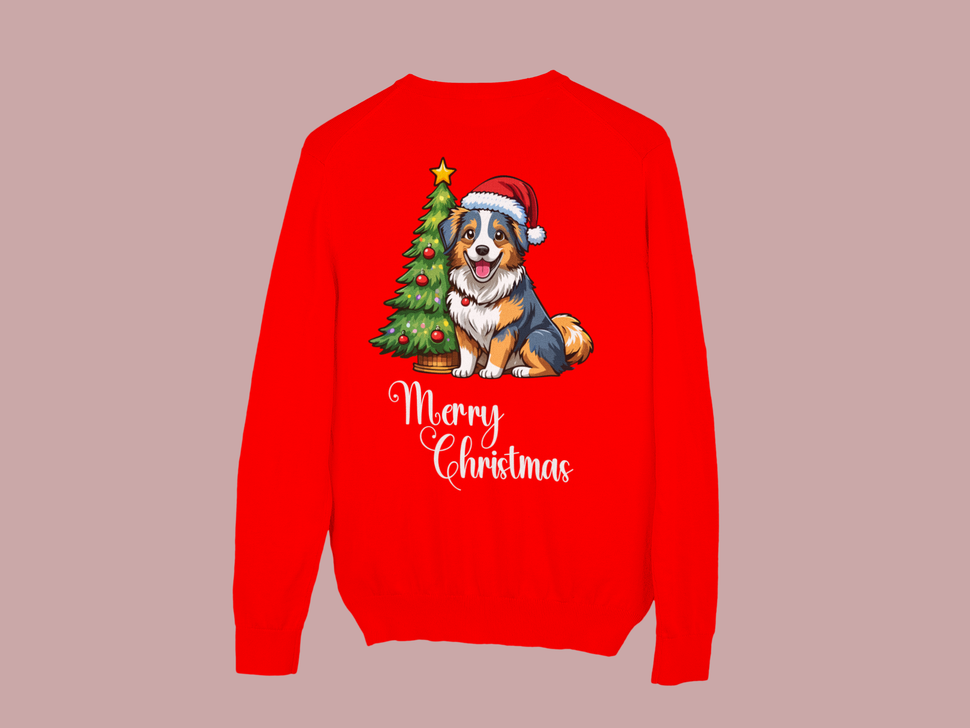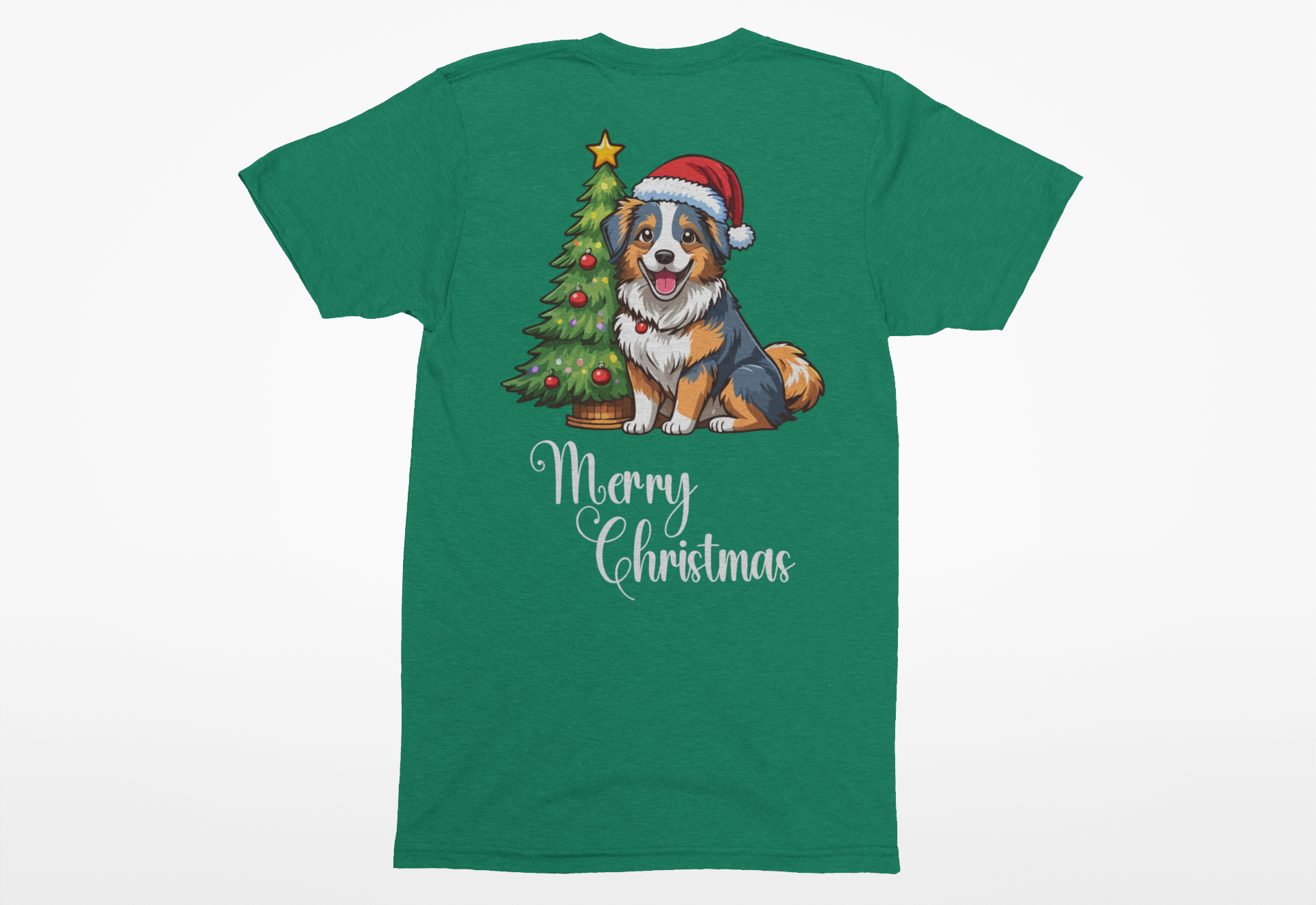 Charming “Merry Christmas” design with an Australian Shepherd in a Santa hat