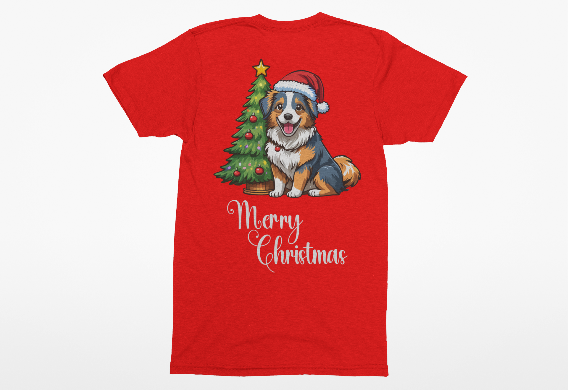 Spread holiday cheer with our Australian Shepherd “Merry Christmas” Tee! This heartwarming design features a lovable Aussie wearing a Santa hat, sitting beside a festive Christmas tree with the cheerful words “Merry Christmas” across the front. It’s the perfect blend of cozy comfort and festive spirit for every dog lover this season.