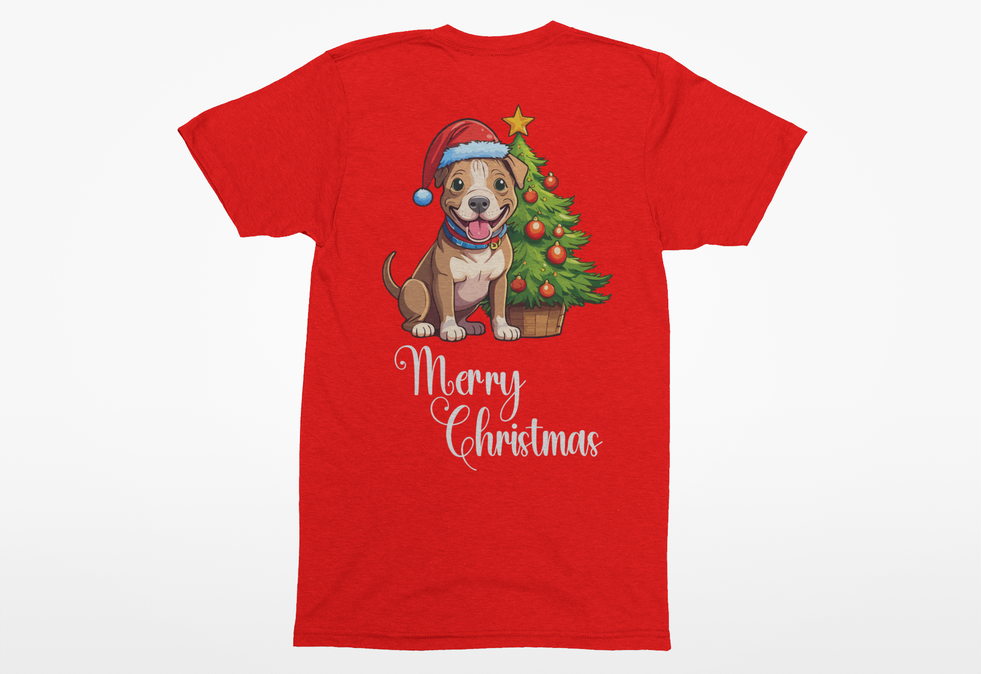 Spread holiday cheer with our Pitbull “Merry Christmas” Tee! This heartwarming design features an adorable Pitbull wearing a Santa hat, sitting beside a festive Christmas tree with the cheerful words “Merry Christmas” across the bottom. It’s the perfect blend of cozy comfort and festive spirit for every dog lover this season.