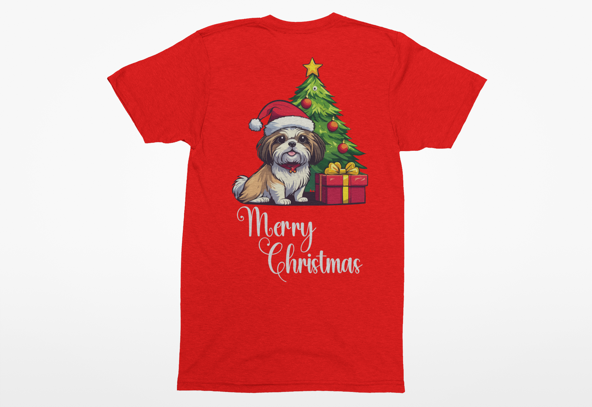 Spread holiday cheer with our Shih Tzu “Merry Christmas” Tee! This heartwarming design features a cute little Shih Tzu wearing a Santa hat, sitting beside a festive Christmas tree with the cheerful words “Merry Christmas” across the front. It’s the perfect blend of cozy comfort and festive spirit for every dog lover this season.