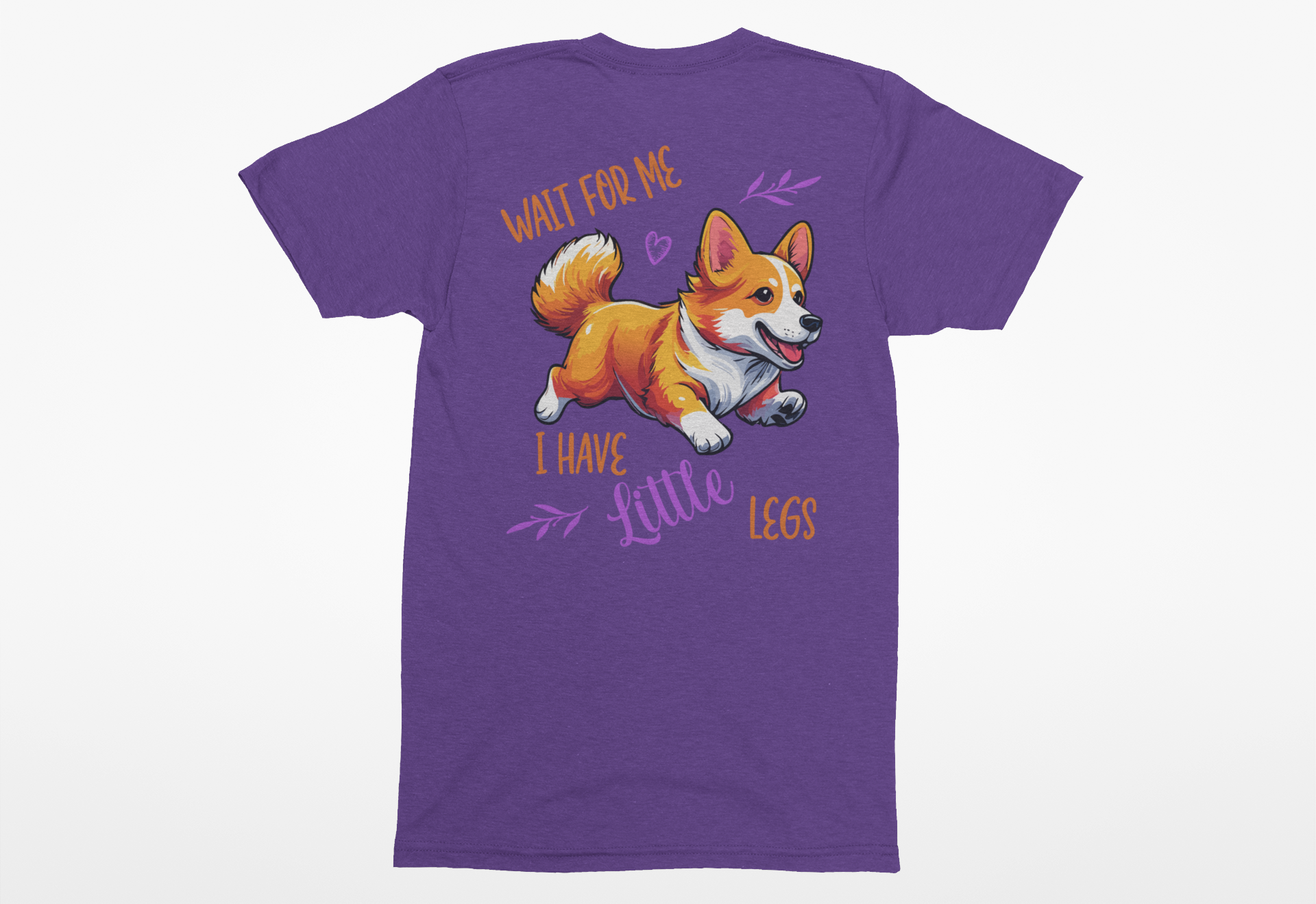 Show off your corgi pride with this adorable graphic tee! Featuring a playful corgi illustration and the funny phrase “Wait for me, I have little legs”, this shirt is perfect for every dog lover who knows that those short legs come with big personality.